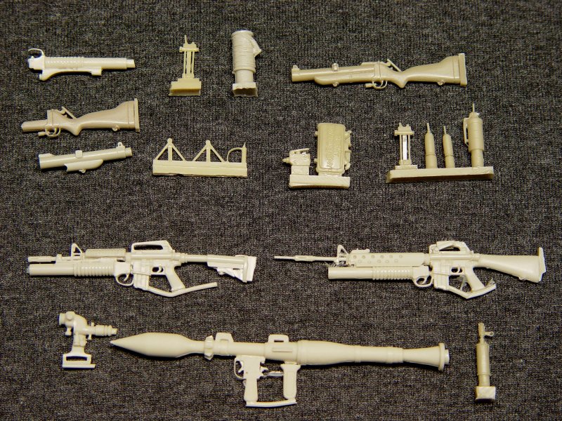 This set comes with seven different versions of the M16 including collapsible stocks, night vision, and even extra clips. The picture you see above is the parts exactly as they came out of the package, no cleanup was done. The packaging is done very well, no parts were broken. The detail level is excellent right down to the non-slip pistol grip. Its all there right down to the open ejection ports and visible bolt, the fire selector switch, and the charging handle.