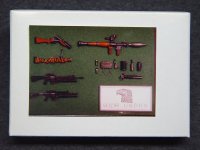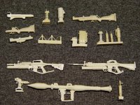 This is a great set of weapons for a 120mm diorama. Its got it all, grenades, claymore, wire, and even an RPG. First lets start out with the claymore mine. You get one mine with the very clear letters of "FRONT TOWARD ENEMY" clearly marked across the front of it. Its accessories include the legs, detonator, and a spool of wire. There is also (my best guess) one standard trip mine and a smoke grenade.