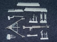 This is the worst of this line of kits for flash and it still isn't that bad! Especially when you look at what they made for you. The detail is exactly what I have come to expect from New Order Models. The receiver cover has an incredible amount of detail on the inside. The M60 has been beautifully reproduced right down to the sight adjustment knobs. What impressed me more than anything else about it is the fact that even with as many small and thin parts as there are in this kit, the only broken piece was one single round in one of the belts of ammo. You get six individual rounds with belt links and two long belts of ammo. You can clearly see each link in the belt, the projectile in the casing, and the ejector ring at the base of the round. The tripod elevation adjustment has all the grooves for the threading clearly visible.