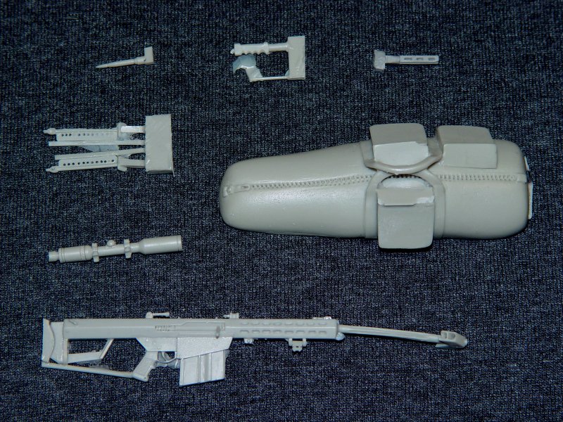 My kit came with a slight droop in the barrel, but that should be no problem to straighten out. This kit comes with one 50 cal round, the rifle, its bipod, the scope, and the carrying bag. You can build this up with or without the scope. All the details are there. The grips are clearly detailed with anti-slip patches. The bolt and return spring is visible with crisp detail. I haven't seen the breakdown bag for the Barrett first hand, but it seems to me the zipper is out of scale.